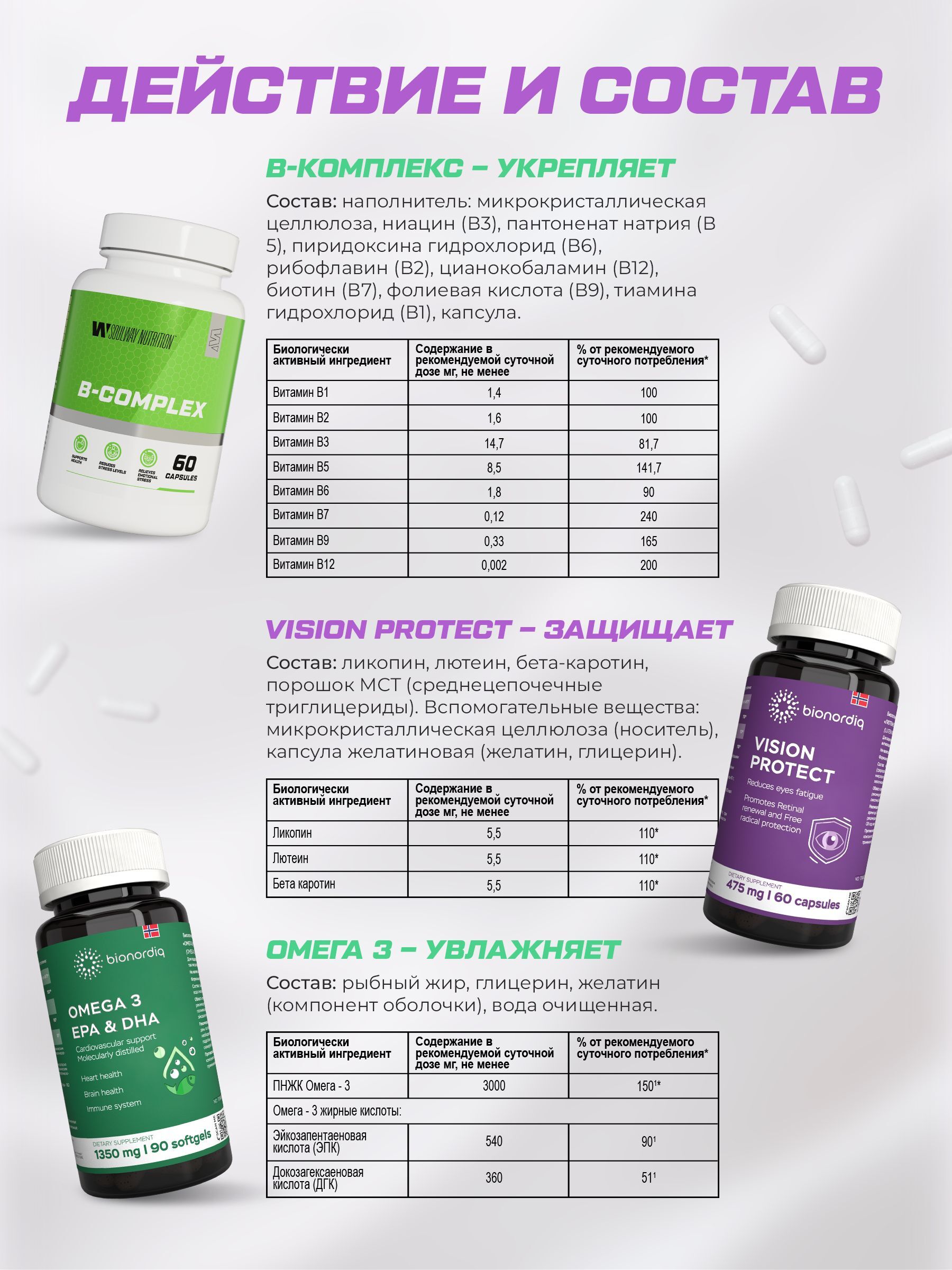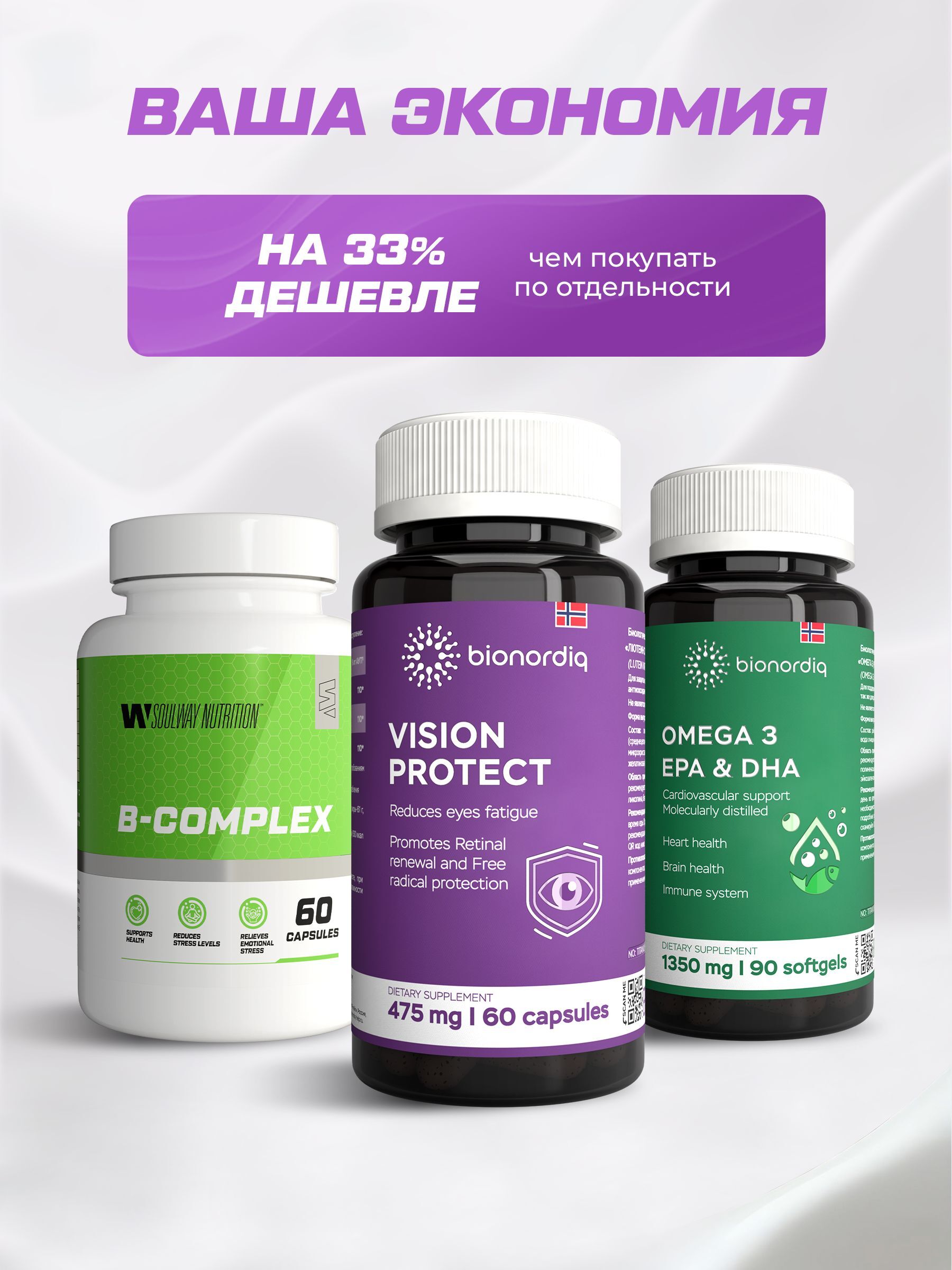 Экран-Комфорт — это трёхкомпонентный курс на 30 дней, который снимает усталость глаз, улучшает фокус и защищает сетчатку от синего света. В набор входят: – Vision Protect (Bionordiq) — каротиноидный фильтр (ликопин, лютеин, β-каротин). – Омега-3 — поддерживает слёзную плёнку и борется с воспалением. – B-Complex — питает зрительный нерв и сосуды.