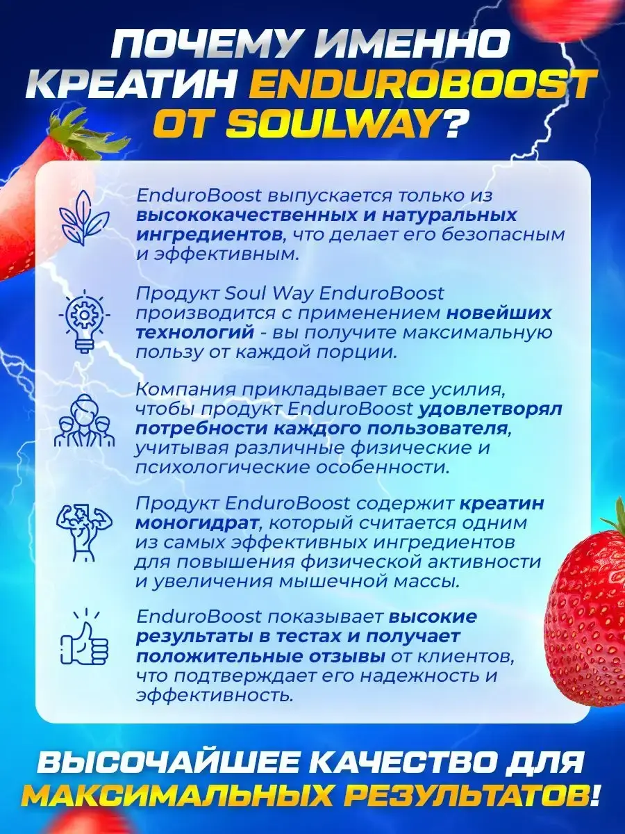 Откройте для себя новые возможности в мире спортивного питания с креатином бренда Soul Way! Наш креатин моногидрат - это сила, энергия и результаты, объединенные в одном продукте. Взаимодействие креатина с тренировками открывает новые горизонты для вашего спортивного прогресса.Спортпит от Soul Way - это не просто спортивное питание для мужчин и женщин, это возможность достичь своих целей в наборе веса и увеличении мышечной массы. Наш креатин моногидрат порошок - это инновационное решение для тех, кто стремится к профессиональному питанию и максимальным результатам в спорте.С добавлением креатина порошка от Soul Way в ваш рацион, вы получаете не только эффективное спортивное питание, но и возможность раскрыть свой потенциал на полную катушку. Не упускайте шанс включить наш креатин моногидрат в вашу тренировочную программу и достичь новых высот в своем спортивном развитии. Soul Way - ваш верный партнер на пути к успеху в спорте!