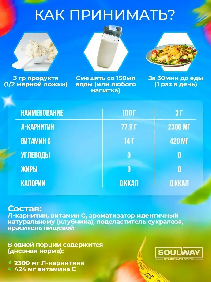 L-карнитин Soul Way - это инновационный жиросжигатель, который поможет вам достичь желаемых результатов в похудении и улучшить вашу физическую форму. L-карнитин является эффективным средством для сжигания жиров и улучшения обмена веществ, что позволяет вам быстрее достичь своих целей. L-карнитин Soul Way способствует улучшению физической выносливости и сокращает время восстановления после тренировок, что позволяет вам тренироваться более эффективно и достигать лучших результатов. Благодаря своим свойствам улучшения обмена веществ, L-карнитин также оказывает положительное влияние на работу сердечно-сосудистой системы, улучшая кровообращение и обеспечивая клетки кислородом. Кроме того, L-карнитин Soul Way помогает укрепить иммунитет и повысить защитные функции организма, обеспечивая вам дополнительную защиту от вредных воздействий окружающей среды. Soul Way предлагает вам высококачественный L-карнитин в различных формах: жидкий, капсулы, порошок, что позволяет выбрать оптимальный вариант для ваших потребностей. Приобретая L-карнитин Soul Way, вы получаете гарантированное качество и результаты, которые превзойдут ваши ожидания. Не откладывайте свои цели на потом - приобретите L-карнитин Soul Way прямо сейчас и начните свой путь к здоровью и идеальной форме!